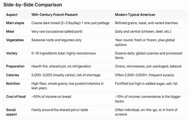 You want proof? Let’s compare the food availability between modern peasants of the USA and the peasants under Marie Antoinette. Here is a chart comparison: